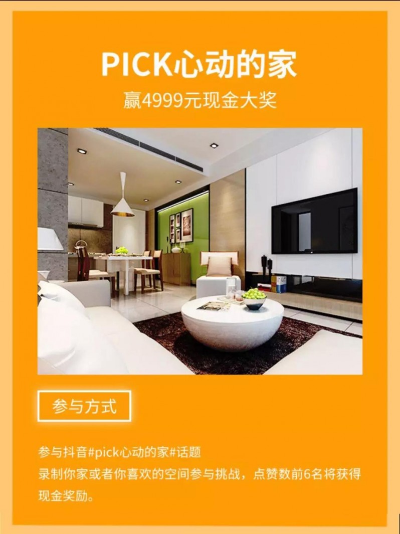 當(dāng)然,除了這些豐富的店慶豪禮外,還準(zhǔn)備了贏4999元現(xiàn)金大獎(jiǎng),參與抖音#pick心動(dòng)的家#話(huà)題,錄制你家或者你喜歡的空間參與挑戰(zhàn),點(diǎn)贊數(shù)前6名將獲得現(xiàn)金獎(jiǎng)勵(lì)。