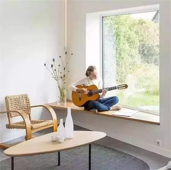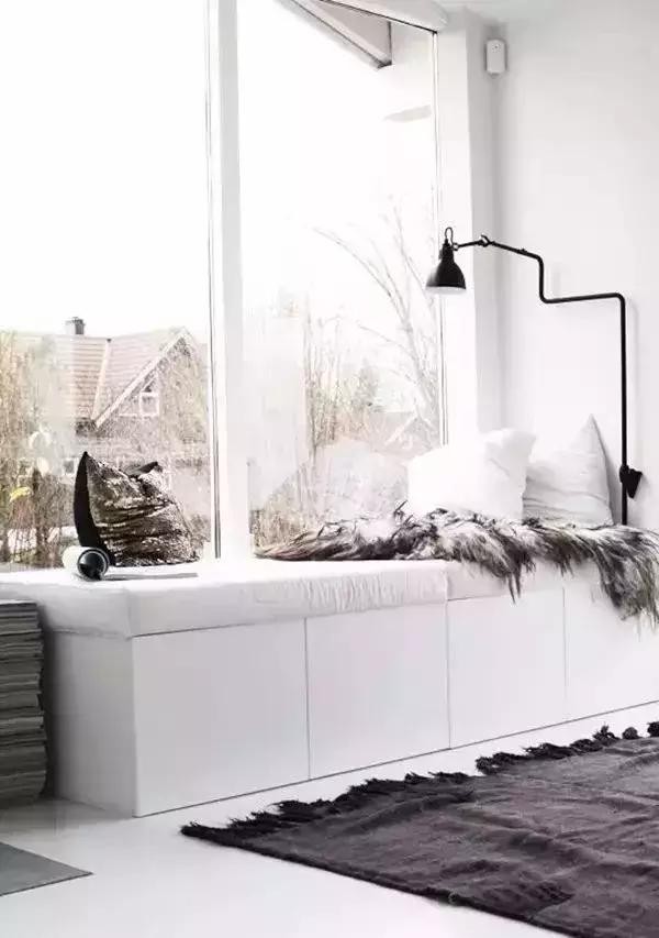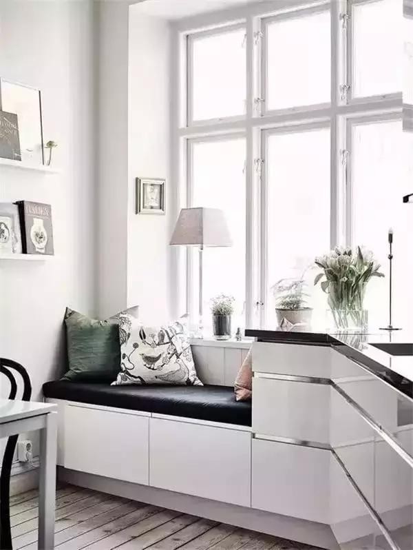 順著墻角和窗戶的線條,放置一個擱板,就能成為一個簡單的飄窗,看看書喝喝茶,不能更美好了。還可以在飄窗下面做成收納柜,美觀的同時還有滿滿的收納能力。