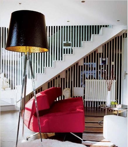 銳角,是大多數(shù)設(shè)計師不喜歡的角度。但這次屋主選擇了挑戰(zhàn),他將銳角切掉,用一個45度角,換了兩個120度角這兩個角,成了一個精彩立面的支點。一個角的邊承接著通往地面的三級臺階,一個角的邊一路向上伸往二樓。構(gòu)筑在這兩條邊上的狹長樓梯虛實相交,一面是縱貫的黑白線條,一面是通透的玻璃圍擋。