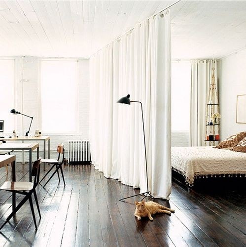 ▲僅運(yùn)用布簾,隔斷臥室空間的同時(shí),和墻壁打造一個(gè)步入式衣櫥,造價(jià)相當(dāng)有誘惑力,適合臥室縱向較長(zhǎng)的臥室。