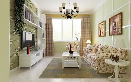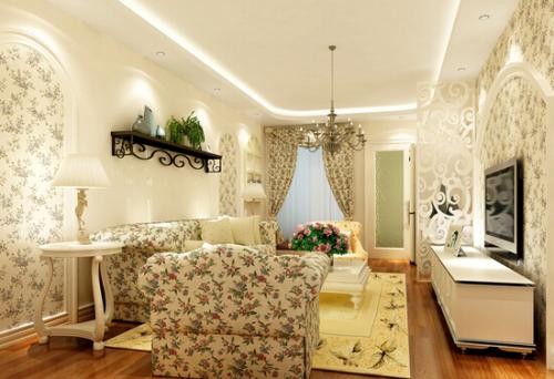 歐式田園風格,設計上講求心靈的自然回歸感,給人一種撲面而來的濃郁氣息。把一些精細的后期配飾融入設計風格之中,充分體現(xiàn)設計師和業(yè)主所追求的一種安逸、舒適的生活氛圍。這個客廳大量使用碎花圖案的各種布藝和掛飾,歐式家具華麗的輪廓與精美的吊燈相得益彰。墻壁上也并不空寂,壁畫和裝飾的花瓶都使它增色不少。鮮花和綠色的植物也是很好的點綴。