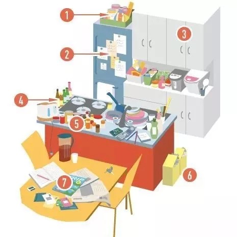 圖中是個(gè)亂糟糟的廚房和餐廳。你的廚房收納是否也有同樣的苦惱呢?