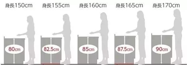 舒適的櫥柜高度=身高/2+5~10 (cm),對(duì)應(yīng)下圖: