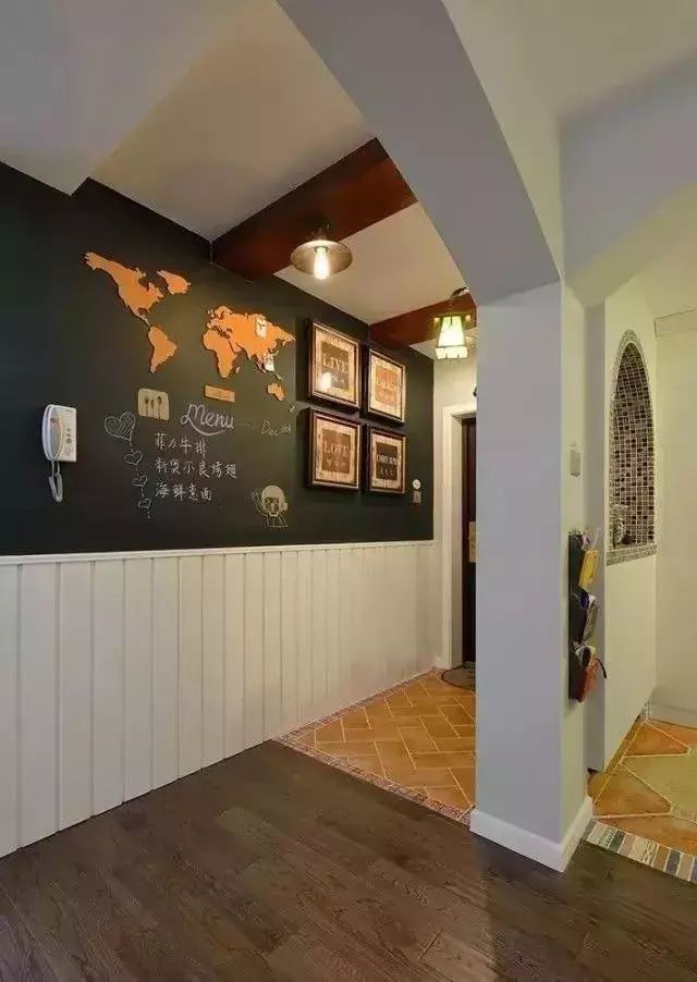 ▲ 玄關(guān)是布置黑板裝飾的入門級(jí)空間,能夠讓人從進(jìn)入玄關(guān)的一刻就感受到主人的生活氣息和創(chuàng)意,還能記事備忘,如需要買的物品、繳費(fèi)等。如果用磁性黑板漆或帶收納的黑板架,能把單張備忘貼在上面,變成家庭信息集中地。