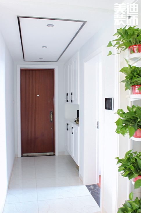 這是入戶玄關,一進門就能看到綠植讓人心情愉悅,大門左側白色木柜與房間整體風格融為一體,整體簡潔、大方,柜子中間部分可以放置進出門需要取放的包包、鑰匙等,下半部分可以放置鞋子,上半部分則可以放置閑置物品。