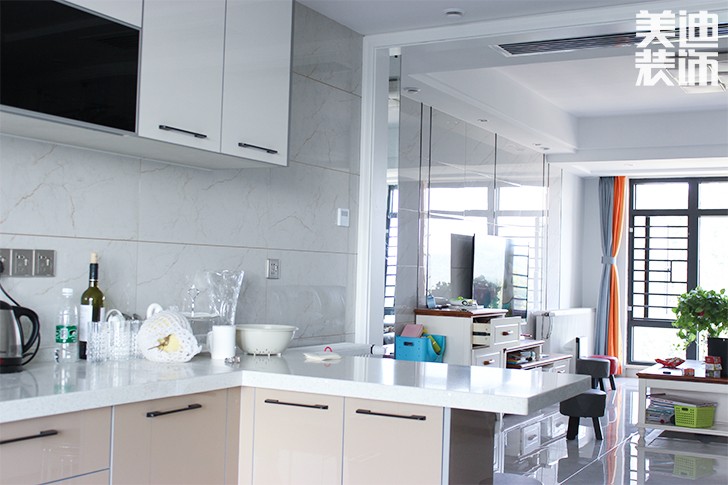本期《美家記》,小美來到佳兆業(yè)云頂梅溪湖曹先生家,曹先生一家崇尚極簡生活,在和設計師張勛溝通后果斷選擇了與他們生活理念一致的現(xiàn)代簡約風。因原戶型廚房與客廳面積太小,設計師考慮到業(yè)主一家平時很少下廚,與業(yè)主溝通后,將廚房與客廳合并在一起。房子自從開工以來,鄰居幾乎不間斷的前來參觀工藝和效果。