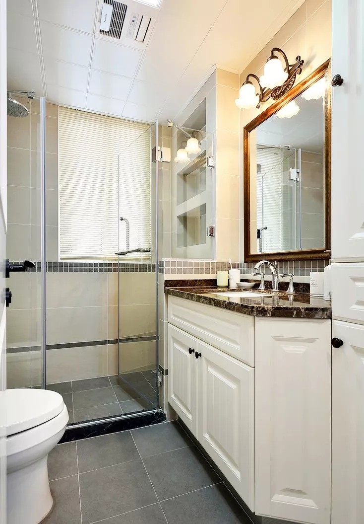 衛(wèi)生間干濕分離做得很好,用玻璃門做了隔斷,頂上留出空間保證空氣流通,洗手盆大理石的臺(tái)面顯得很大氣,不顯臟和水漬,很實(shí)用。