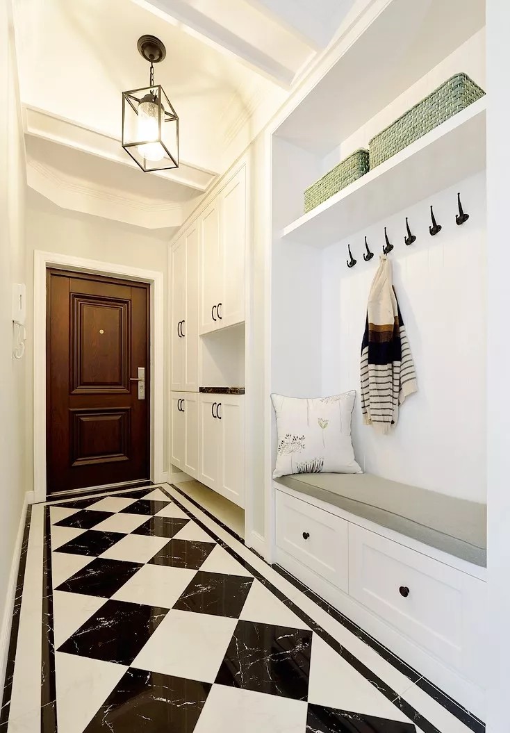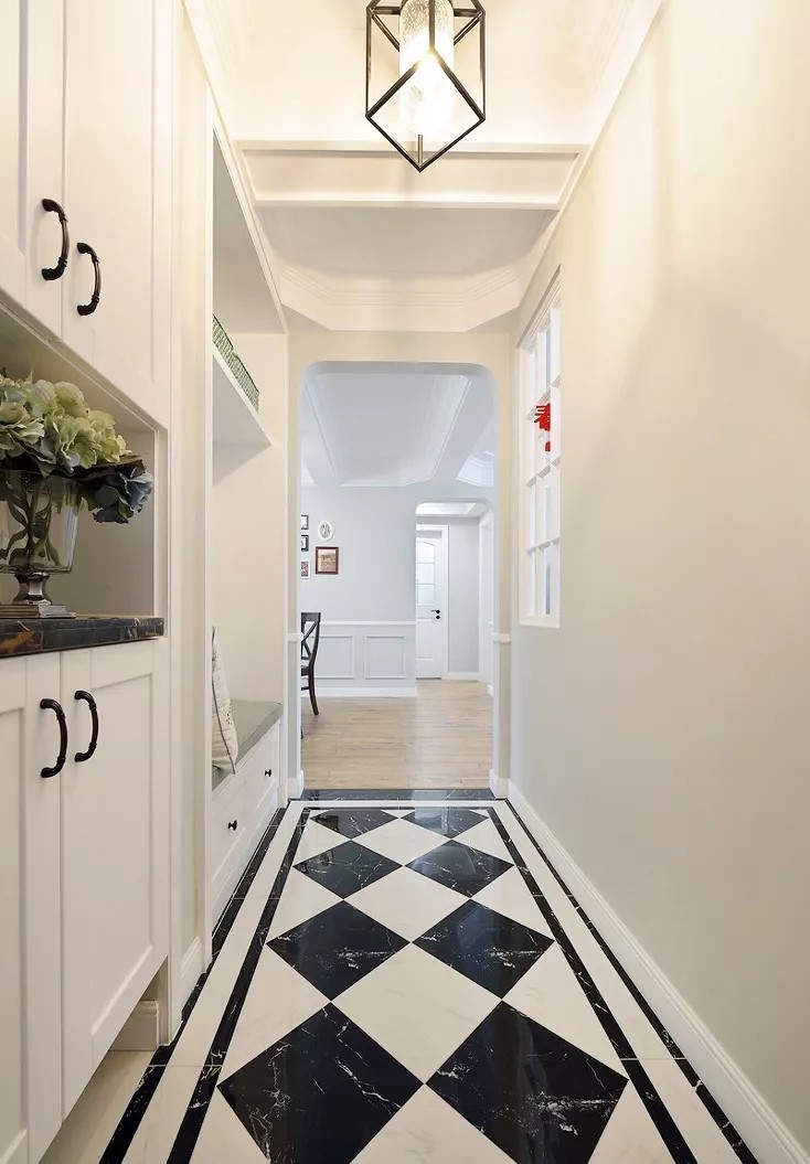 造型獨(dú)特的吊燈也是精心挑選的,地板是采用的黑白格子的,對(duì)稱鋪滿,整齊大氣有質(zhì)感。