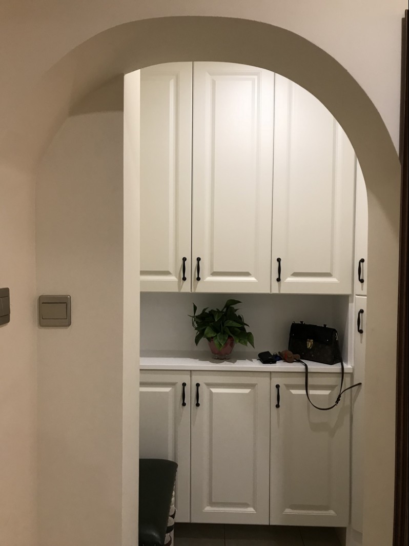 開(kāi)門(mén)入戶,一扇圓弧形設(shè)計(jì)的玄關(guān)讓人瞬間有種偷窺的沖動(dòng)。因?yàn)闃I(yè)主楊姐與設(shè)計(jì)師劉麗娟同為女性,在鞋子收納上有著強(qiáng)烈的共鳴。設(shè)計(jì)師為解決楊姐家中鞋子的收納,經(jīng)過(guò)多次協(xié)商取得同意后,利用樓梯的安全通道,往外擴(kuò)充4㎡左右,入戶鞋柜的增加既滿足了業(yè)主楊姐儲(chǔ)藏需求也保證了樓梯安全通道的正常使用。
