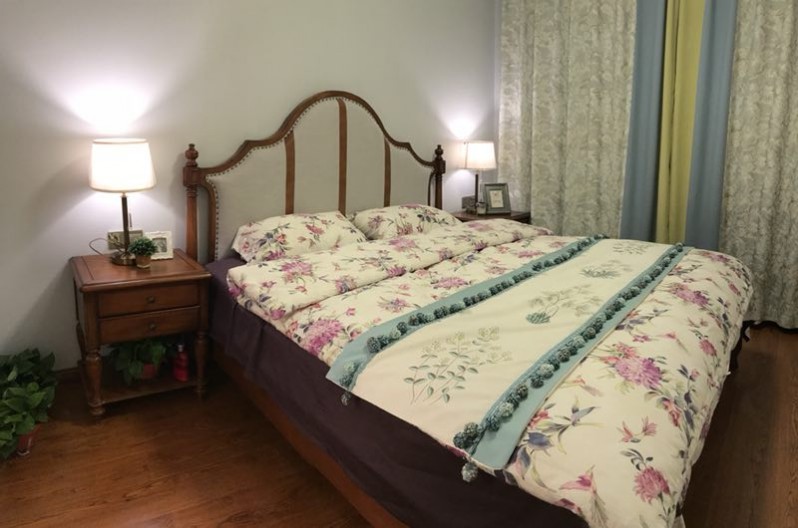 主臥以舒適度為主,淡綠色窗簾輕柔舒爽,配上花紋床品,層次感呼之欲出,優(yōu)雅精致生活突顯。