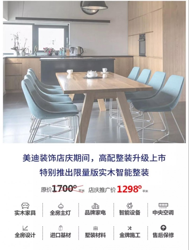 原價1700元/平米,店慶推廣價1298元/平米,全系墅裝主材+全系進(jìn)口基材+全系生態(tài)實(shí)木免費(fèi)升級+全房品牌家電大贈送+全房品牌家具大贈送+智能設(shè)備免費(fèi)送。