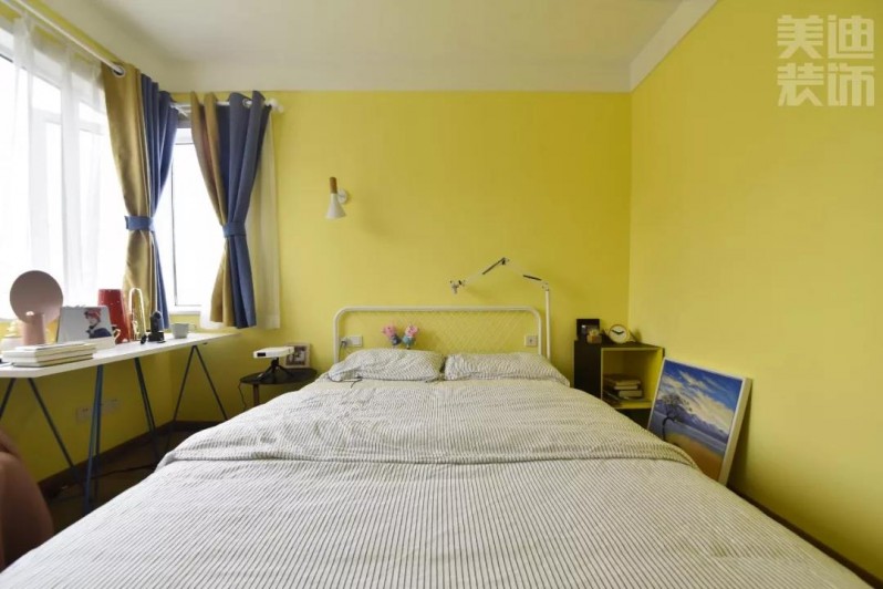 臥室的墻面整體刷成明亮的黃色,視覺(jué)上非常清新陽(yáng)光,給人一種溫煦柔和的氛圍,營(yíng)造一個(gè)輕松舒適的休息空間。