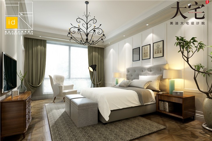 臥室設(shè)計(jì)在頂層,淺綠色的窗簾和白色的床上用品,凸顯主人高雅的品味。