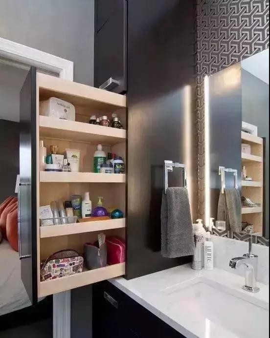 這個應(yīng)該是少有人想到的,鏡子背后也能收納物品,不僅如此,還非常的方便,一物兩用??梢宰畲蟪潭鹊睦每臻g面積,把經(jīng)常取用又容易造成空間雜亂的物品收藏在鏡子后面,能讓洗手臺變得干凈清爽。相當(dāng)于鏡子后面定制置物架,不過更美觀、省事。