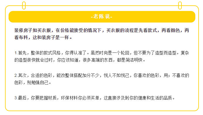 你聽懂了嗎?不知道裝修如何下手,就想想自己平時逛商場挑選衣服。先認(rèn)定整體的款式風(fēng)格,之后選擇喜歡的顏色,最后材質(zhì)還得把控。如果你心中還沒有底,請容許我們接著往下說。