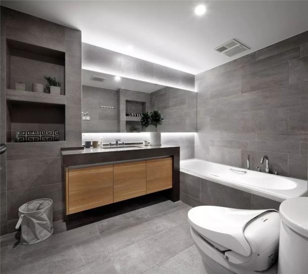 2、雖然灰色和黑色顯得神秘、高級,但是顏色把控不好的話,衛(wèi)生間會顯得昏暗潮濕。所以在衛(wèi)生間燈光的配合上需要注意下,比如可以用筒燈、鏡前燈、燈帶等綜合配光;