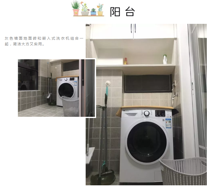 陽臺(tái)區(qū)域,在并不寬敞的空間內(nèi),通過定制的家具滿足功能及儲(chǔ)物需求,洗衣機(jī)上方空間也沒有浪費(fèi),裝個(gè)吊柜也是收納儲(chǔ)物的好地方。