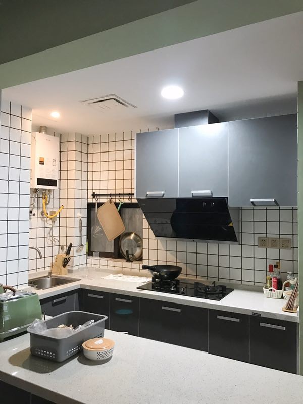 玄關(guān)旁邊就是廚房,開放式的客餐廳設(shè)計(jì)為小空間帶來更為通透靈活的視覺感受。廚房采光不好,墻面用小白磚有提亮作用。為了合理利用空間,制定了上下兩排廚柜,完全滿足日常需求。