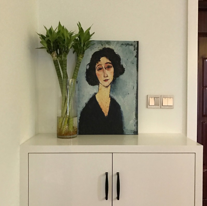 進(jìn)門玄關(guān)設(shè)計(jì)很簡單,有一塊小走廊連接著廚房與客廳,走廊角落里擺放了一個(gè)儲(chǔ)物柜,可以放一些出門隨手物品。儲(chǔ)物柜上放置了一幅現(xiàn)代人物油畫和生機(jī)勃勃的綠植,搭配得剛剛好,一進(jìn)門就擁有好心情。