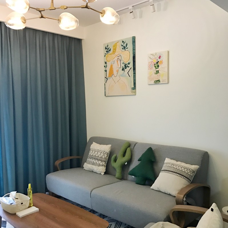 客廳墻面使用綠色+白色,視覺上比較舒服。為了讓顏色豐富一些,沙發(fā)上擺放了幾個(gè)顏色不同的靠枕。布藝沙發(fā),慵懶舒適,讓人有種想躺上去的沖動(dòng),沙發(fā)背景墻用了兩幅畢加索抽象油畫做裝飾,抽象的線條、繽紛的色彩很有格調(diào)。