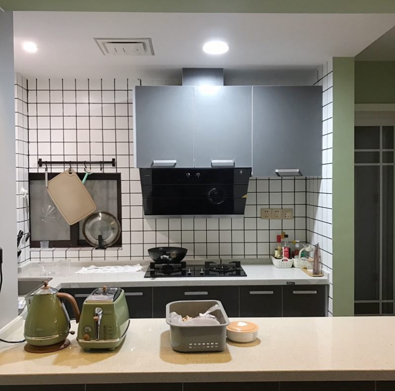廚房連著吧臺(tái),溫潤的奶白色大理石吧臺(tái)搭配優(yōu)雅的灰綠色的小家電,竟然營造出日式安寧的空間氛圍。