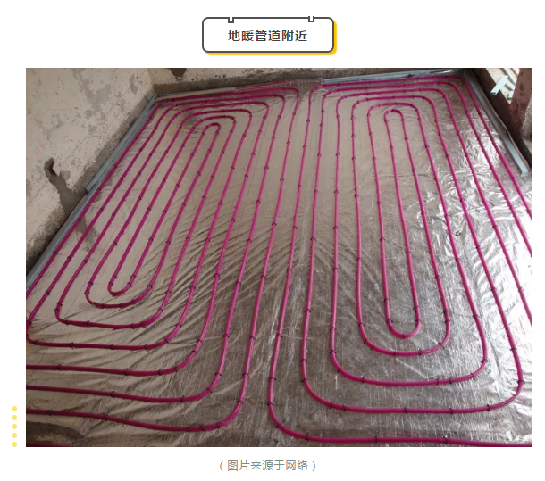 安裝地暖的家中,冬天取暖時(shí),室內(nèi)、外溫差較大,靠近門窗的地?zé)峁艿罉O易產(chǎn)生冷凝水,向下方混凝土滲透,所以安裝地暖的管道附近也需要做防水處理。