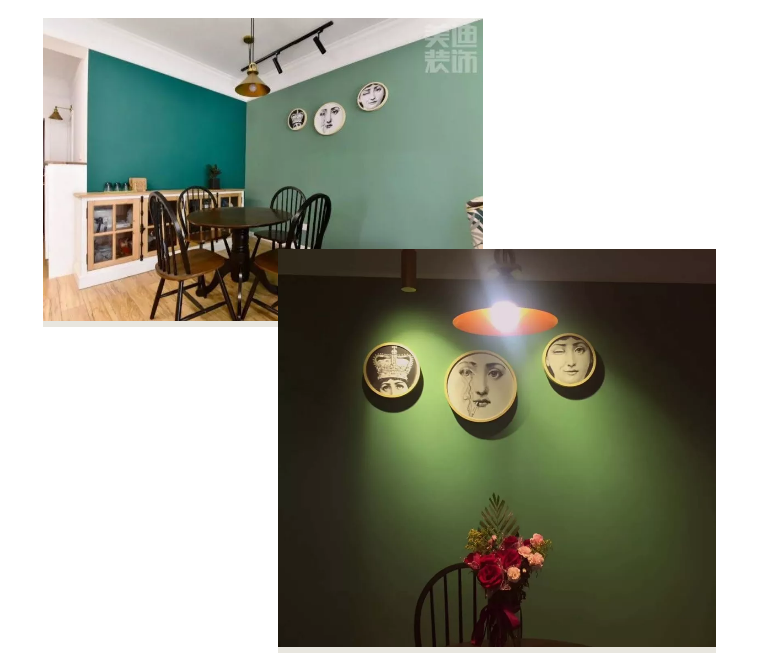 餐廳延續(xù)客廳的綠色與原木色基調,并用兩種墨綠色形成對比來達到空間的層次感。同時為了緩解面積小造成的空間壓抑感,設計師沈文臻老師選用了成品裝飾柜來代替酒柜。