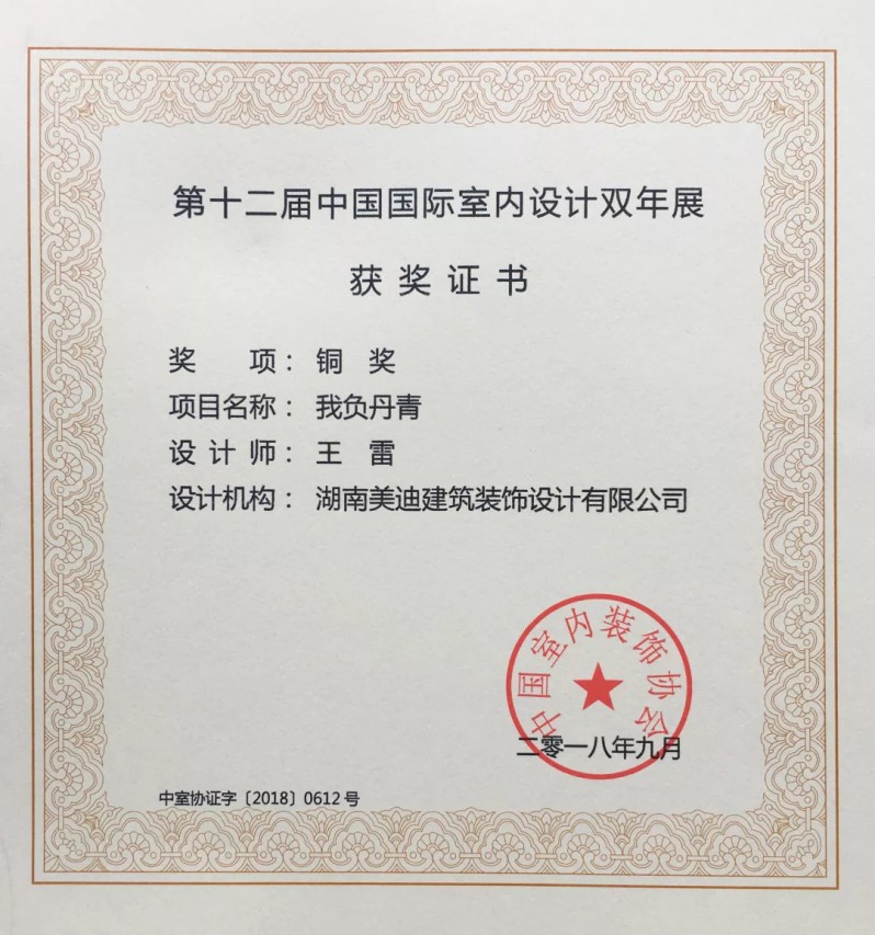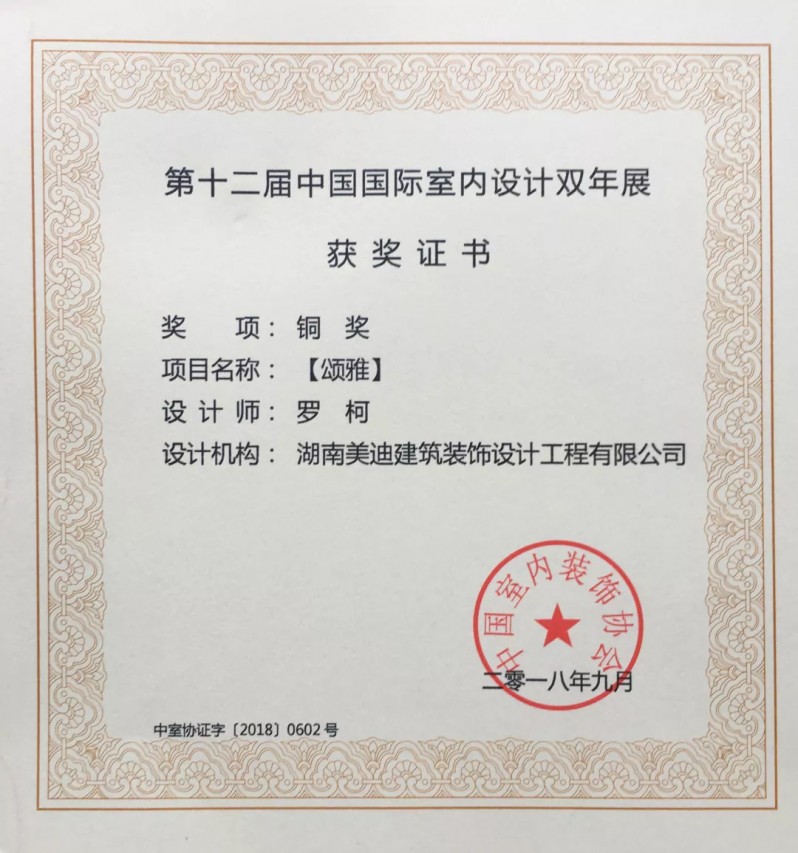 除美迪裝飾獲得“中國室內(nèi)裝飾行業(yè)優(yōu)秀企業(yè)”之外,美迪裝飾設(shè)計(jì)師趙益平(美迪大宅 設(shè)計(jì)院院長)、周港(總店 設(shè)計(jì)總監(jiān))榮獲“中國室內(nèi)裝飾行業(yè)優(yōu)秀設(shè)計(jì)師”稱號,設(shè)計(jì)師羅柯(總店 高級設(shè)計(jì)師)作品-《頌雅》、王雷(南店 主任設(shè)計(jì)師)作品-《我負(fù)丹青》獲得第十二屆中國國際室內(nèi)設(shè)計(jì)雙年展-銅獎。