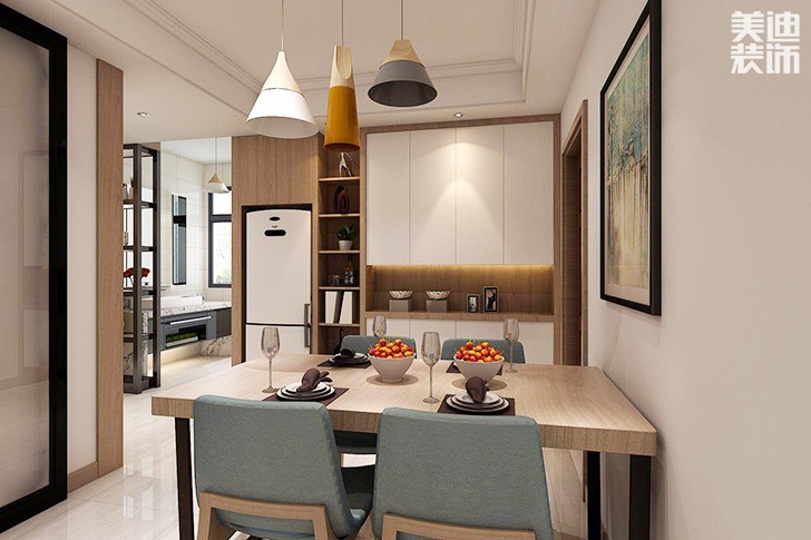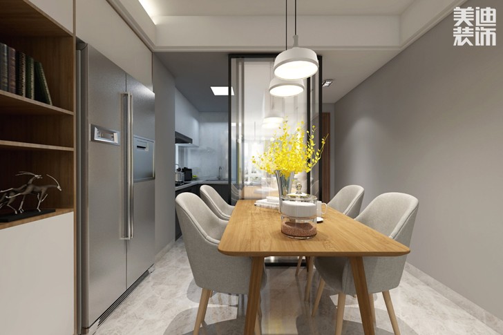 餐廳與廚房開放式的設(shè)計更符合現(xiàn)代年輕人的生活式,更加時尚,也增加了整體空間的寬敞舒適度