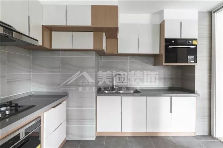 ◆2.一字型廚房裝修注意吊柜高度。廚房小,但是收納物品多的情況下,吊柜承擔(dān)收納任務(wù),但是吊柜高度應(yīng)考慮不影響臺(tái)面操作。