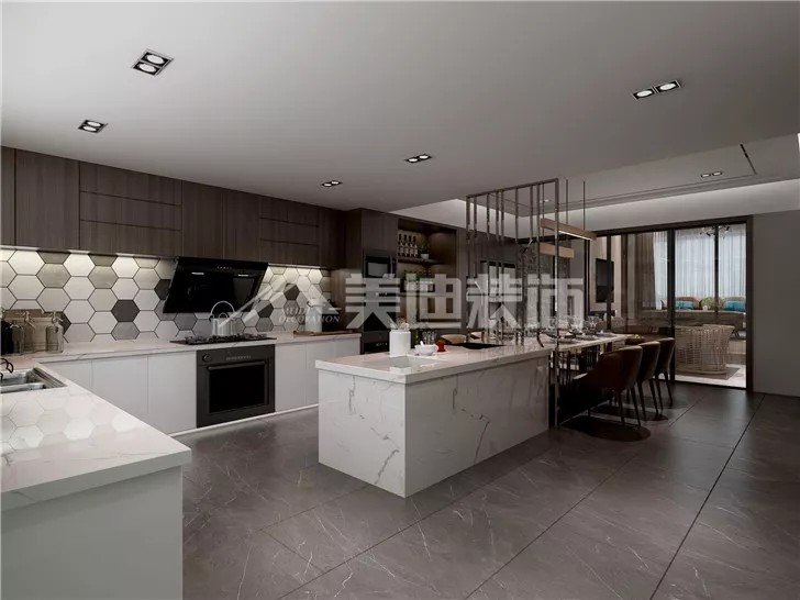 島型廚房布局:即是有雙操作臺(tái),中間留出通道,呈現(xiàn)島型設(shè)計(jì)。多數(shù)是開(kāi)放式廚房中會(huì)選擇的布局。島型布局的要求是廚房寬度和深度要夠,面積要寬敞,不然沒(méi)辦法滿足島型布局。