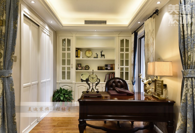 △質(zhì)感厚實的書桌和美式座椅,深棕的色調(diào)看起來嚴肅且莊重,靜謐中散發(fā)出書卷香,書桌上復(fù)古擺鐘和裝飾品成為亮點。簡單的白色書柜,擺放了書籍和相片框,少了點華麗多了點輕松隨意。
