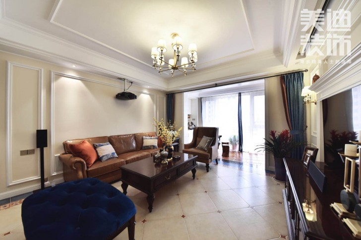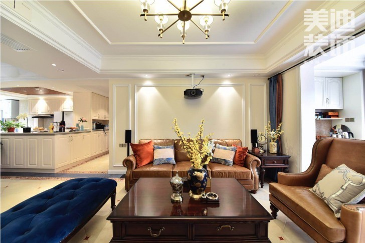 △沉穩(wěn)厚重的茶幾,質(zhì)地柔軟的棕色皮沙發(fā)優(yōu)雅舒適,再加上橙色、藍色絲絨抱枕的點綴,給人以溫馨的感覺。