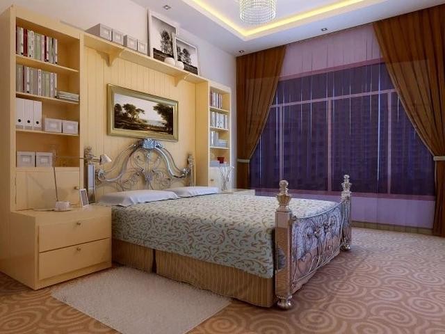 采用簡潔和素雅的裝修,帶有線條的裝飾。臥床背景墻是用實木砌成的木墻,橫向紋理,宛如水波般柔和,天花板也異曲同工。窗簾也選擇了豎條褶皺紋理,與橫紋垂直呼應(yīng),整個臥室線條感特別的強烈,讓人感覺清爽而富有魔力!是很多都市男女喜歡的一款臥室裝修!