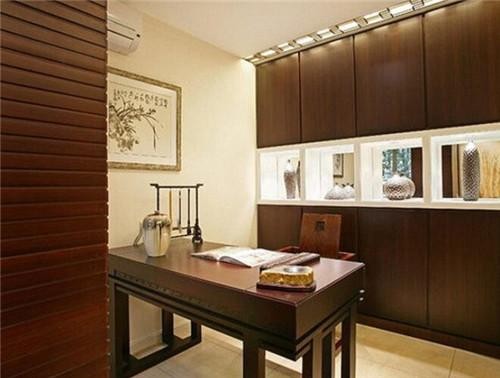 打造了嵌入式的書柜,書柜的中間還留出了展示區(qū),可以用來擺放各式的工藝品。書柜的前面則擺放著實(shí)木的書桌椅,這些都極大程度上沿襲了傳統(tǒng)的中式書房特色。