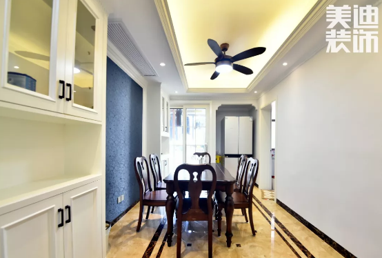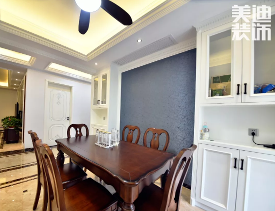 家居都選用深色實木,餐桌也不例外,為了不讓實木色和白色搭配太過單調(diào),在兩側(cè)的收納柜中間,設(shè)計了跟客廳沙發(fā)墻一樣獨特的藍色背景墻。