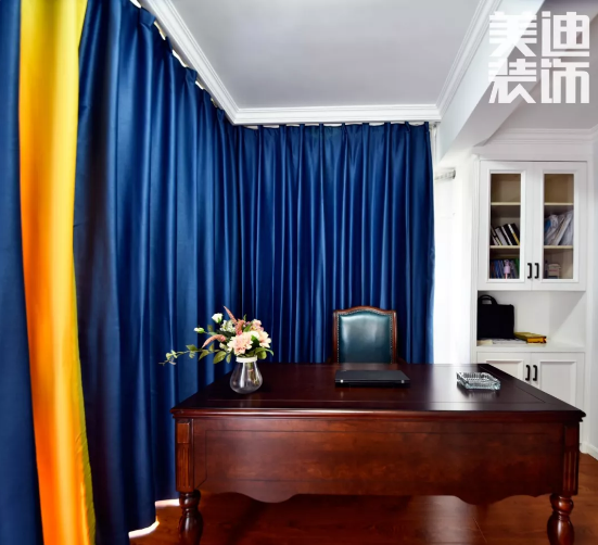 旁邊的窗簾同樣是藍黃相間,大面積的藍中間加入一縷黃色,猶如身處海洋中的晚霞,給人無限的溫暖、希望。