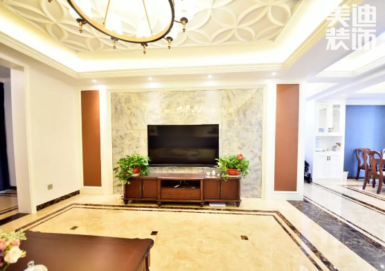 電視背景墻為避免瓷磚又太過單調(diào),所以陳昌設(shè)計師從瓷磚的紋理上面入手,選擇有著大理石紋理的瓷磚,既容易清潔,又和地板紋理相同。