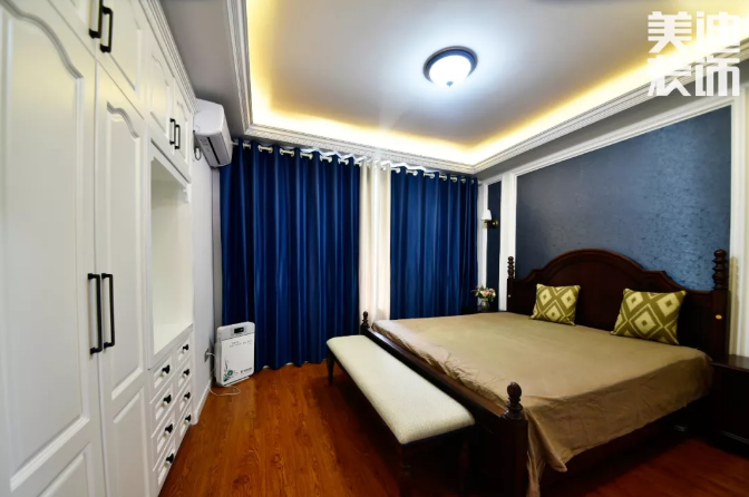 主臥窗簾顏色是藍白相見的色調(diào),加上簡約的燈飾,搭配上深藍的家居,很符合小美風(fēng)的獨特韻味,床頭柜的花點綴更是恰到好處
