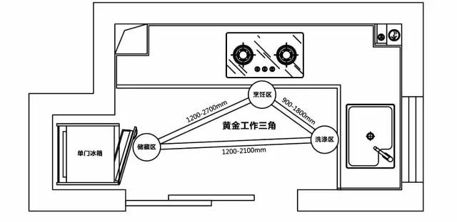 黃金三角臺面:根據(jù)廚房使用動線規(guī)劃:取材、摘理、洗滌、切配、烹飪、盛放六步進行臺面設計,儲藏區(qū)、洗滌區(qū)、烹飪區(qū)使用頻率最高,合理動線設計形成“黃金工作三角區(qū)”