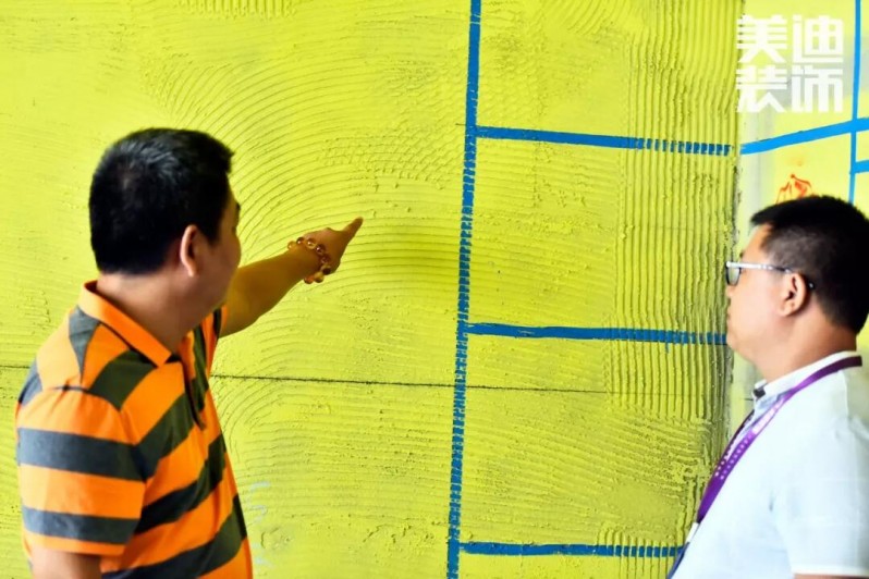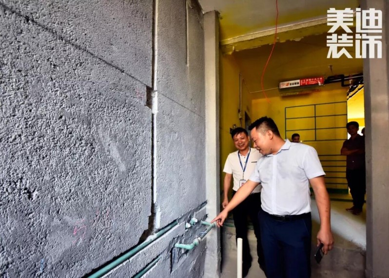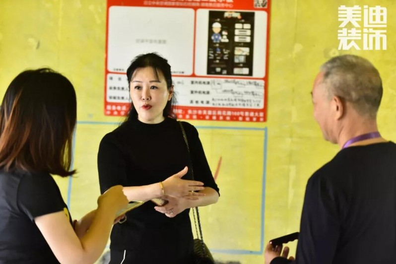 △ 美迪裝飾總裁江總對(duì)材料選擇、管道開槽、強(qiáng)弱電走向等施工細(xì)節(jié)進(jìn)行了細(xì)致詢問與檢查。