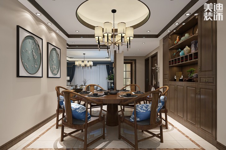 餐廳采用中式的餐廳設(shè)計,背景墻采用系列的掛畫設(shè)計,增加了統(tǒng)一性。新中式風(fēng)格在設(shè)計上延續(xù)了明清時期家居配飾理念,提煉了其中經(jīng)典元素并加以簡化和豐富,在家具形態(tài)上更加簡潔清秀,同時又打破了傳統(tǒng)中式空間布局中等級、尊卑等文化思想,空間配色上也更為輕松自然。