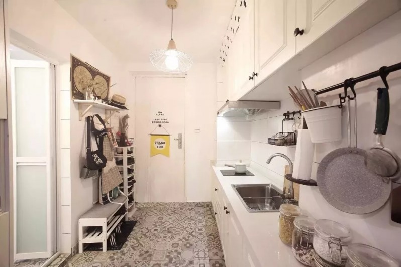 以白色調(diào)為主的北歐風(fēng)設(shè)計(jì),白色難免讓人覺得單調(diào),設(shè)計(jì)師在地面做了花磚設(shè)計(jì),豐富了空間,顯得清新文藝。