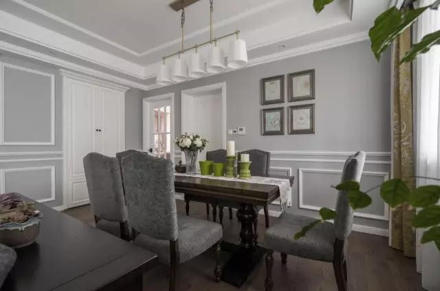 深色餐桌與灰色餐椅組合,配上綠色的燭臺(tái)和鮮花,整個(gè)餐廳看起來(lái)和諧也不失活潑、有情調(diào)。