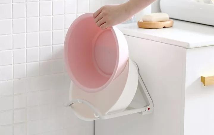 如果地上空間不多的話,還可以利用墻面空間,馬爸爸網(wǎng)站上有很多款式的臉盆掛鉤,往墻上粘或者吸盤。而且很多掛鉤也可以同時(shí)收納N個(gè)臉盆,也是可以盆套盆。墻上或者浴室柜的側(cè)面等,哪里有空,或者哪里不礙事就掛哪里。