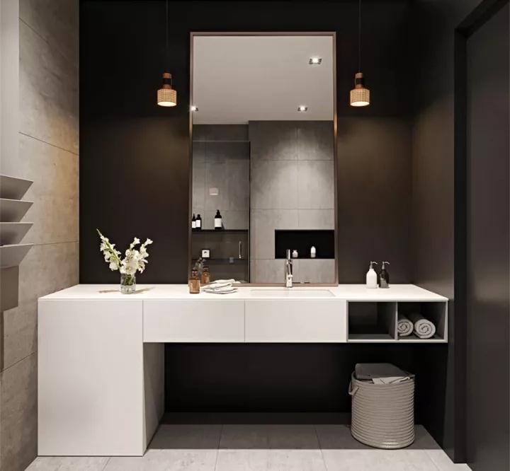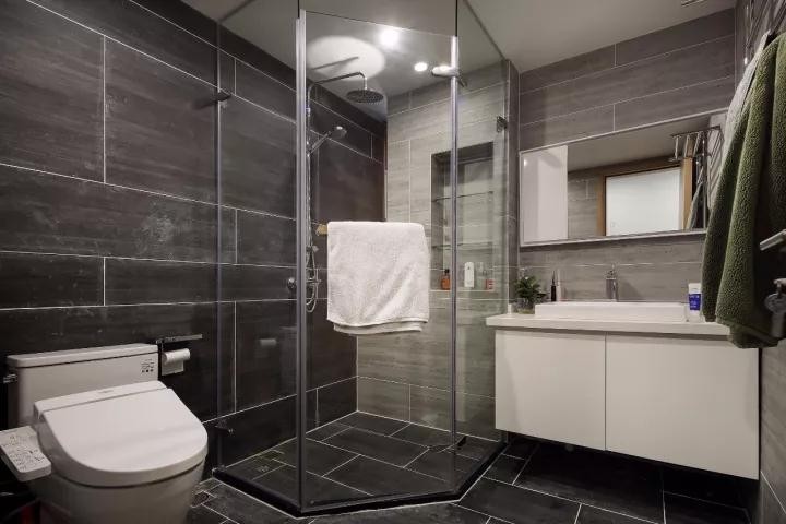 第一,做個(gè)大型的浴室柜子,把臉盆放柜子里面,浴室的東西都有地方放不說,小物件都能"藏"起來,就顯得干凈清爽多了~