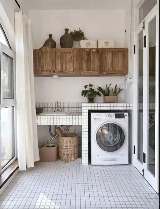 有時衛(wèi)生間面積不大,放了洗衣機就沒什么空間了,那就把它塞進廚房吧。廚房有上下水,水路的改造方面不會太麻煩而且國外非常流行這樣的方法。