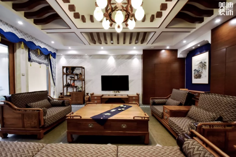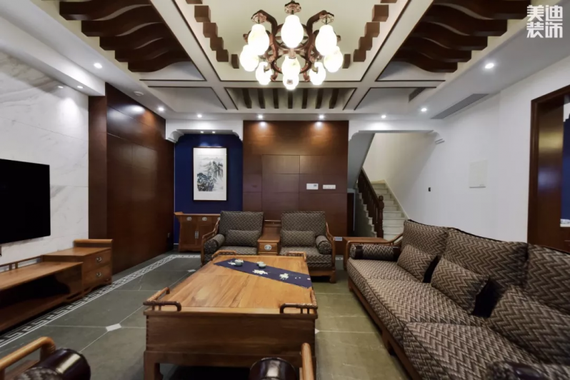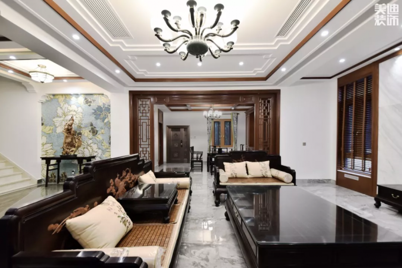 客廳布置采用獨具特色的明式家具,是中式風格中簡約的代表。血檀家具配上淺色大理石地板和電視背景墻,深淺對比,剛柔并濟。