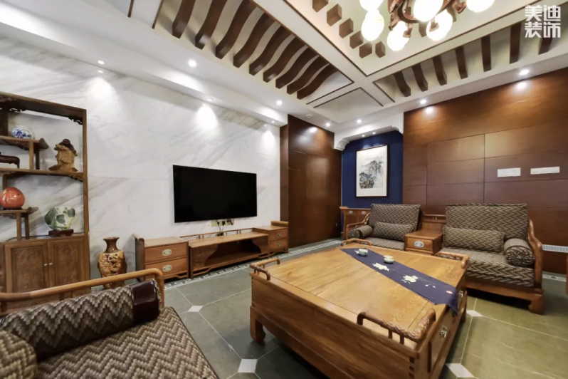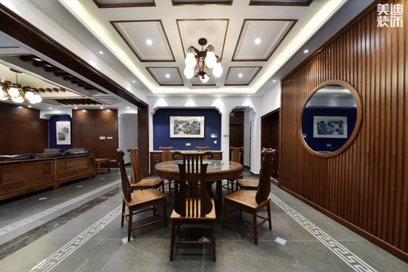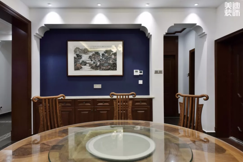 墻面運用的是中國風如意回紋造型,再掛上一副山水畫,充滿詩意的場景油然而生。