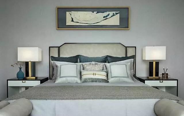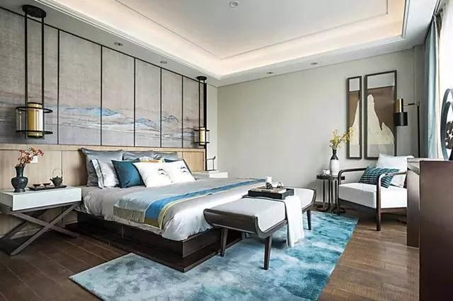 臥室采用灰色,古畫屏風式的背景墻和水藍色的地毯讓這里顯得更為有格調(diào)。